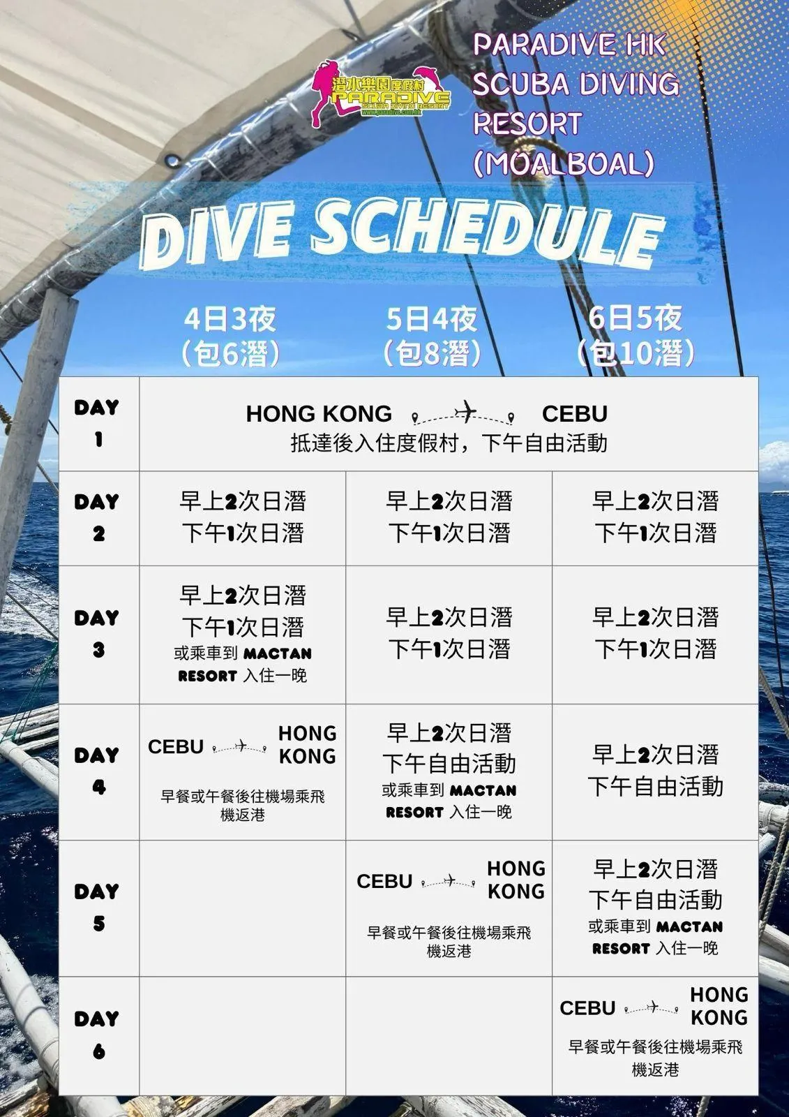 | Moalboal非會員專享套餐 | 6日5夜 | 5日4夜 | 4日3夜 |